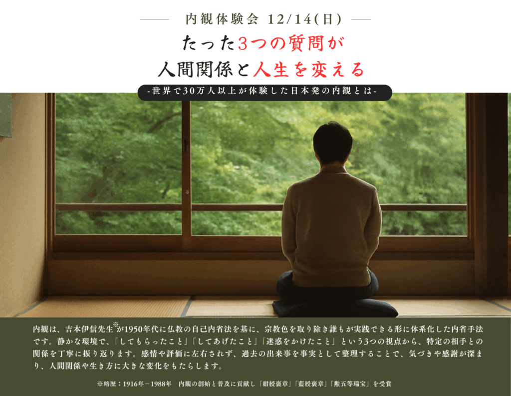 「集中内観」、「マインドフルネス」、「未来ビジョン設計」、「自然農体験」といったアプローチを組み合わせ、心の深い部分から “本当の自分” を再発見し、これからの人生を自分の手に取り戻すための時間を丁寧にサポートします。