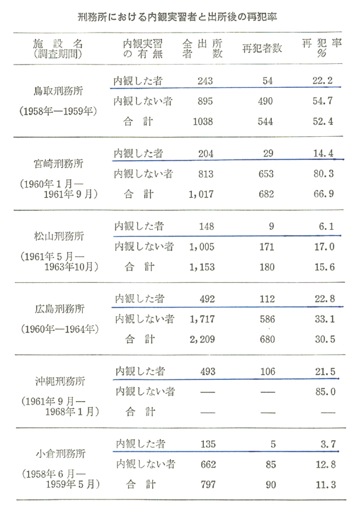 その後、内観は人間関係に悩む個人だけでなく、企業の人材育成、精神科医療、薬物依存の回復支援、さらには受刑者の更生教育へと広く活用されるようになりました。とくに矯正分野では、約6,000人を対象とした調査で、再犯率が1/3~1/5に低下する という顕著な成果も確認されています。